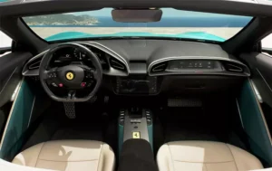 Despite weighing 1,556 kg — 86 kg more than the coupe — the Spider matches the coupe’s 0–100 km/h time and completes the 0–200 km/h sprint in 9.4 seconds, actually 0.4 seconds quicker than the coupe. For enhanced handling, Ferrari has equipped the Spider with brake-by-wire technology and an active rear spoiler that generates up to 110 kg of downforce at 250 km/h with minimal drag penalty.