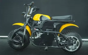 Disc brakes on both wheels The mini bike has a single‑sided trailing‑link front suspension and a rear monoshock. Braking is via mechanical, cable‑operated disc brakes front and rear—similar to bicycle disc systems, not hydraulic units.